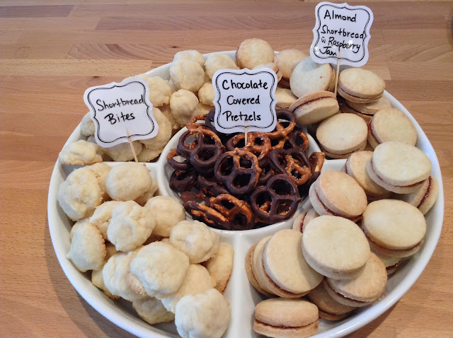 These are new to the repertoire. I wanted to replace the almond biscotti with something almond-y but not as complicated as real linzer cookies. So I found a twist on regular shortbread and sandwiched them with some homemade raspberry jam!
